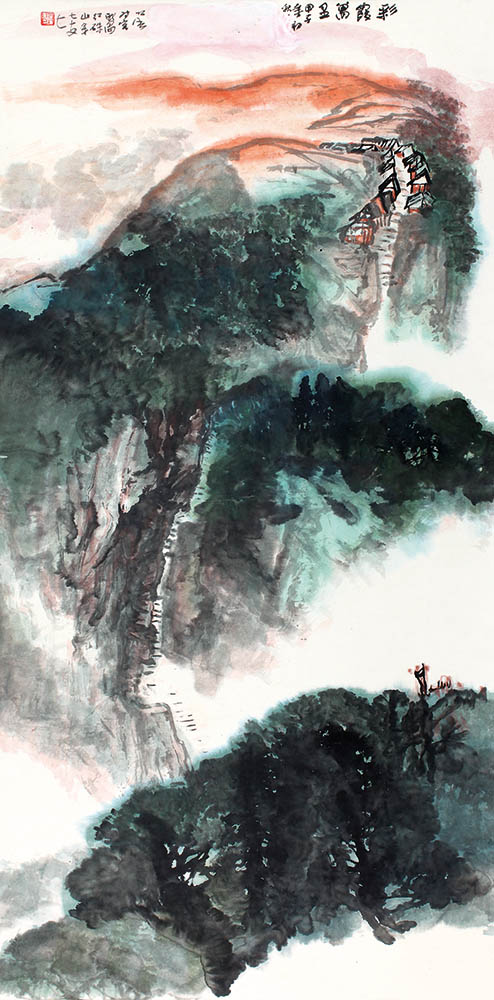 款识:彩霞万里。甲子年初秋九躬时客涐眉红硃山年七十又七。