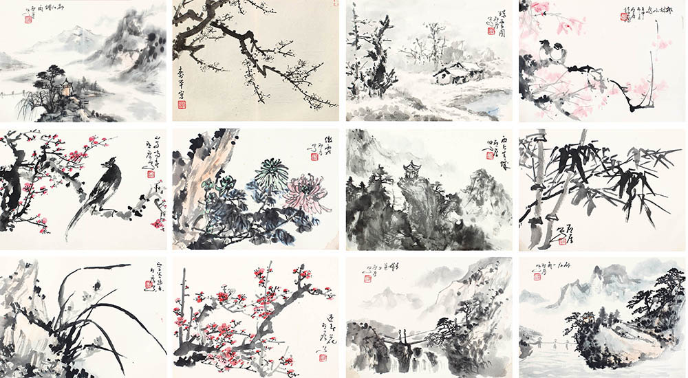 简介:董寿平(1904-1997):当代著名画家、书法家。原名揆,字谐柏,后改名寿平,山西省临汾市洪洞县人。早年毕业于天津南开大学和北京东方大学。曾为中国书法家协会顾问,中国美术家协会会员,北京荣宝斋顾问,全国政协书画室主任,北京中国画研究会名誉会长,山西省文物研究会名誉会长,中国人民对外友好协会理事,中日友协理事,北京对外友协副会长,全国第五、六届政协委员。雷启厚(1917-2007):中国书画大师董寿平弟子,美术教育工作者。中国董寿平书画艺术研究会理事,四川省美协会员,山西省美术研究会顾问,成都市政协书画院画师,都江堰市美协顾问,山西省艺术研究会顾问。 款识:封面:雷启厚山水花鸟册,寿平题。1、寿平写。2、瑞雪图,启厚写。3、枫林小鸟,壬申冬月启厚指画。4、小鸟鸣春,启厚写。5、傲霜,启厚写。6、雨后青城,启厚写。7、启厚写。8、空谷幽香,启厚写。9、迎春花,启厚写。10、青城道上,启厚写。11、都江一角,启厚写。12、都江烟雨,启厚写。