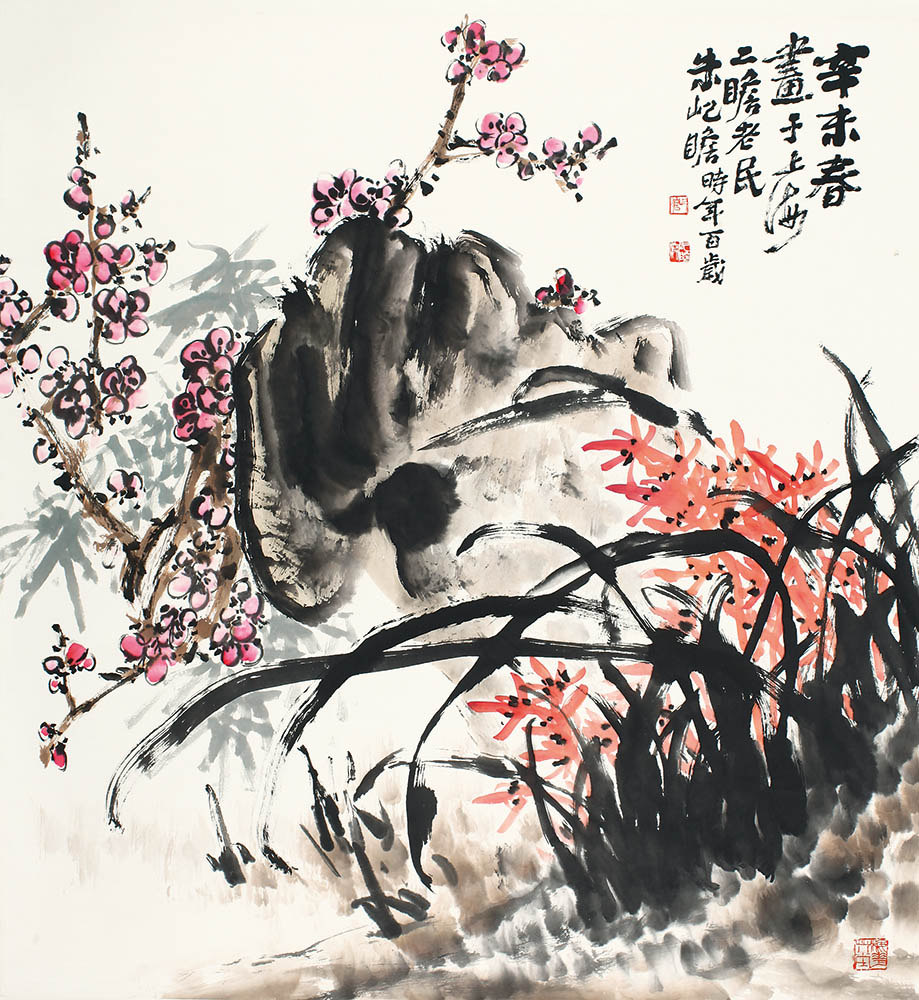 款识:辛未春画于上海,二瞻老民朱屺瞻时年百岁。