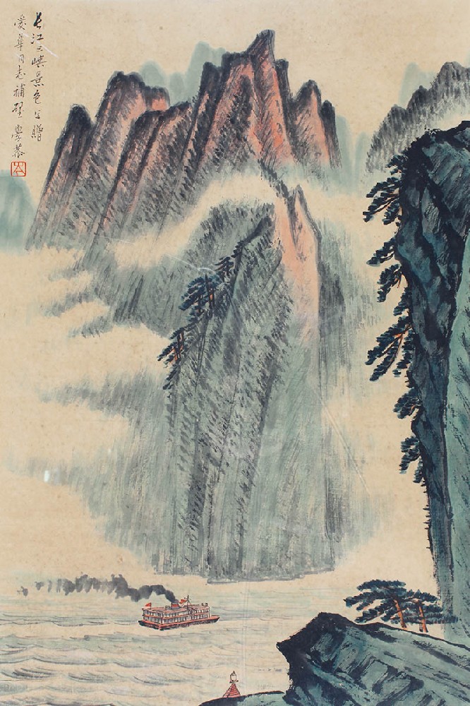款识:长江三峡景色写赠爱华同志補笔,学恭