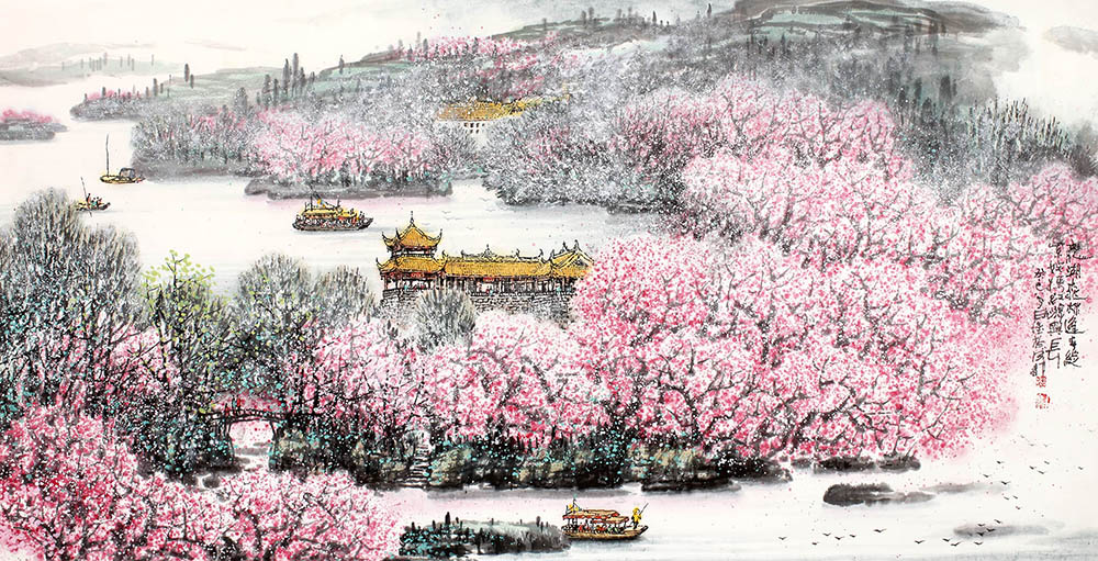款识:龙湖桃林逢春绽,紫姹嫣红游兴长。癸巳八月由怀于成都。