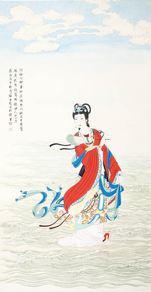 款识:河洛之神事渺茫,陈思作赋句生香。惊鸿丽影凭谁写,想像伊人水一方。岁次丙子秋月蕴玉赵石于锦里。