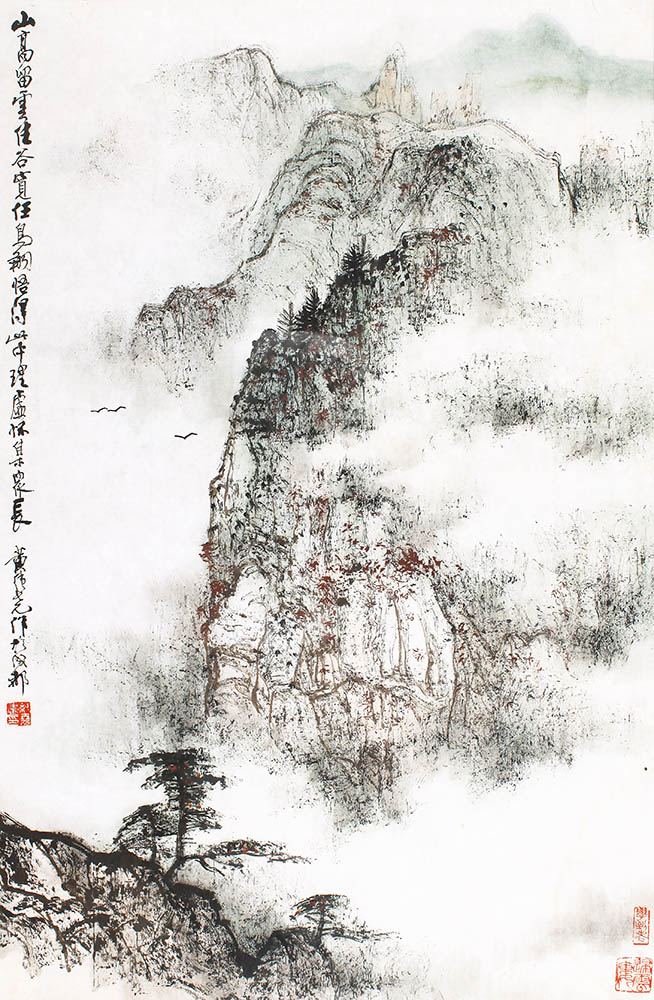 款识:山高留云住,谷宽任鸟翔。悟得此中理,虚怀集众长。黄纯尧作于成都。