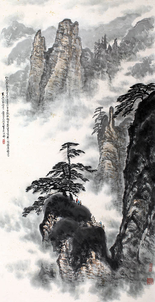 款识:仙风搅动九天云,深谷高山一口吞。飘渺烟云添画意,游人陶醉涌诗情。万兴老弟雅赏,黄纯尧丙子写于成都。