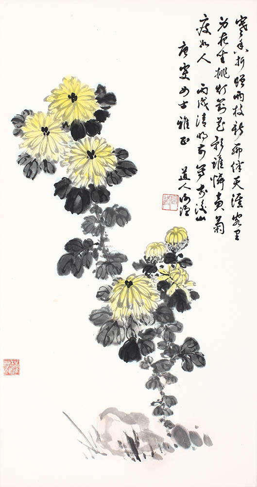 款识:寒香折赠两枝新,聊伴天涯客里身。夜坐挑灯对花影,谁怜黄菊瘦如人。丙戌清明前写于后山,唐雯女士雅正,道人谢渔。