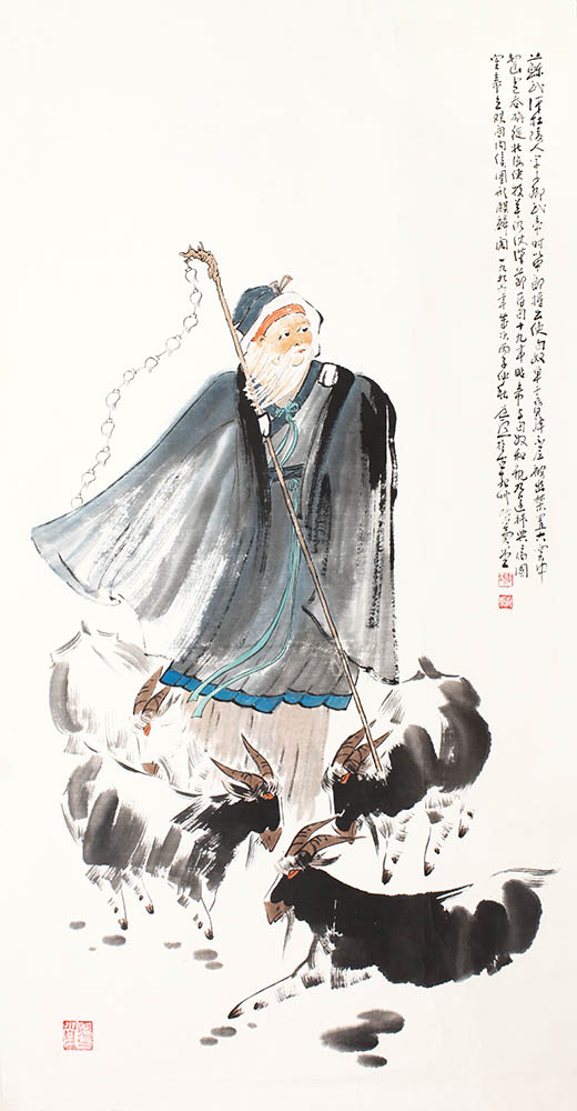 款识:苏武汉杜陵人,字子卿。武帝时以中郎将出使匈奴。单于胁降不屈,被幽禁至大窑中。啮雪吞旃徙北海,使牧羊,仍仗汉节。留匈十九年,昭帝与匈奴和亲,乃还拜典属国。宣帝立,赐关内侯,图形麒麟阁。一九九六年岁次丙子仲秋,道熙于古嘉州紫气堂。