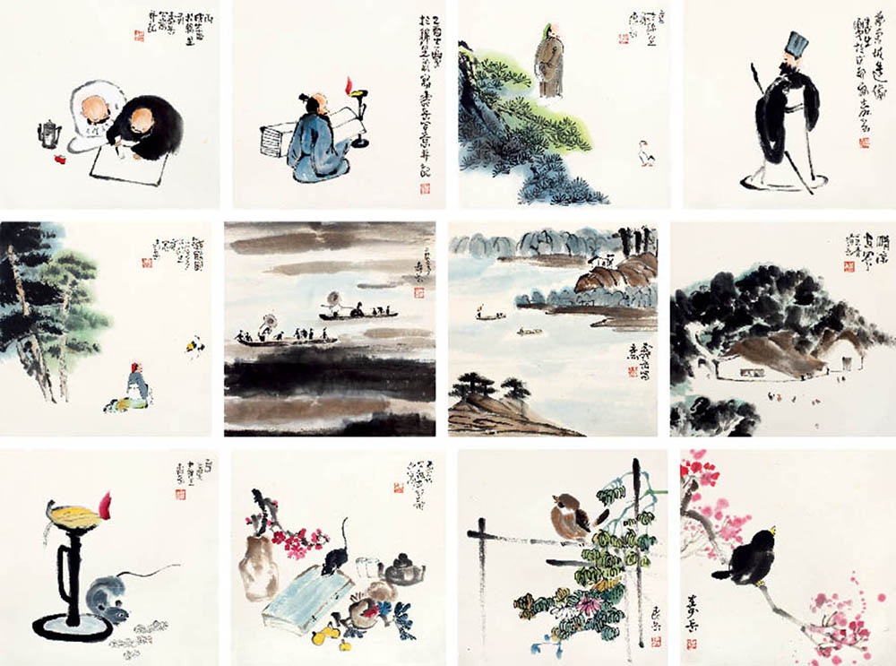 款识:封面:陈寿岳中国画小品册页。2012年12月题(12幅)。1、丙戌之春于锦里西,寿岳写意并记。2、乙酉之夏于锦里西寓,寿岳写意并记。3、乙酉于锦里西,寿岳。4、为东坡造像,甲戌之夏于成都西,寿岳。5、观鹤图。乙酉冬月于锦里西寓,寿岳。6、乙酉冬月,寿岳。7、寿岳写意。8、清凉世界,丁丑春寿岳。9、乙酉之夏于锦里,寿岳。10、寿岳写趣于成都西寓。11、寿岳。12、寿岳。