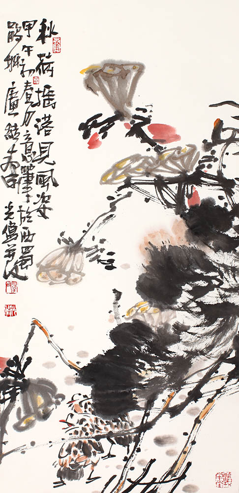 款识:秋荷摇落见风姿。甲午初春月意笔于西蜀鹃城,广结善缘,光伟并记。