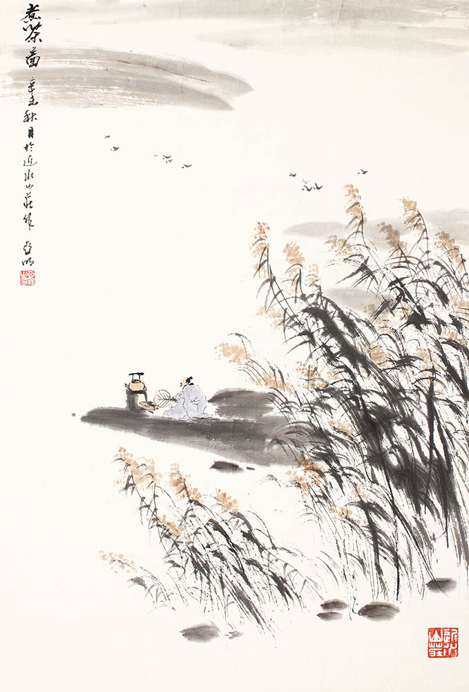 款识:煮茶图。辛未秋日于近水山庄作,亚明。