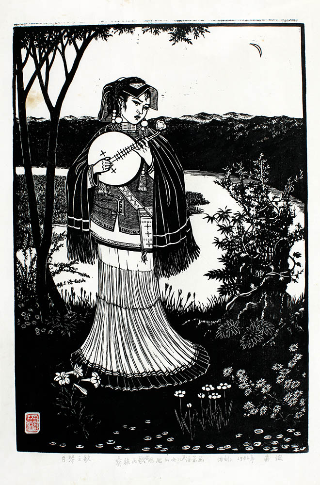 款识:月琴之歌。彝族民歌《妈妈的女儿》诗意画,(木刻),1956年,苗波。